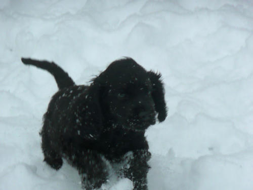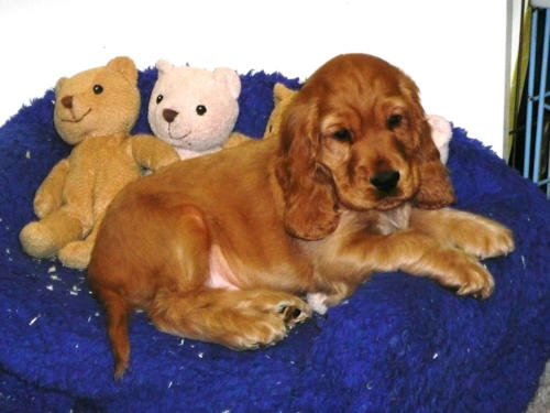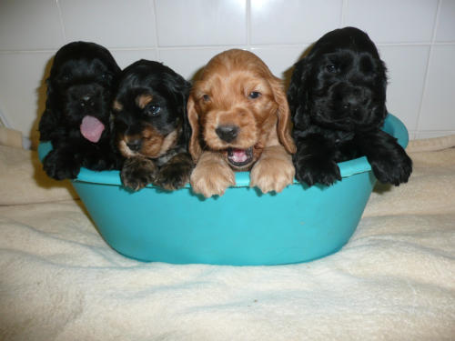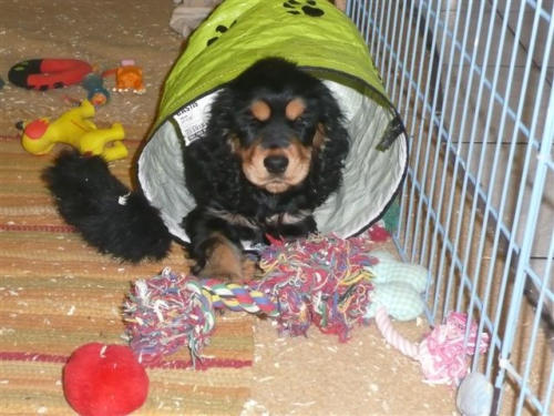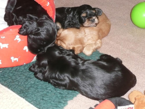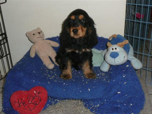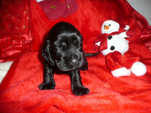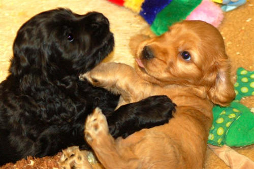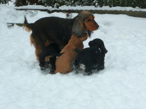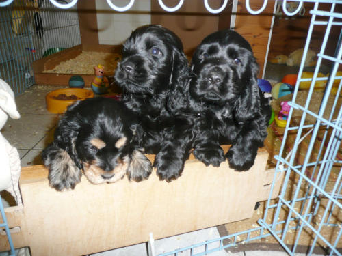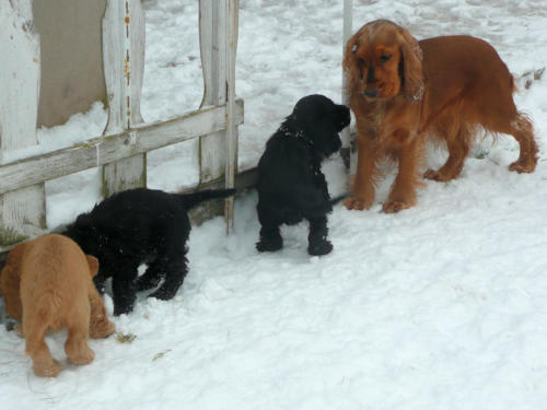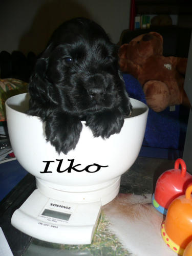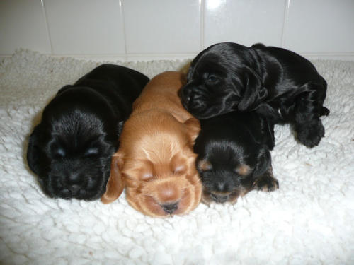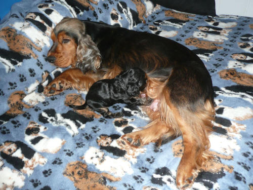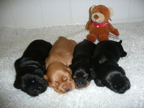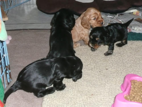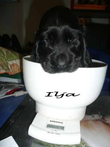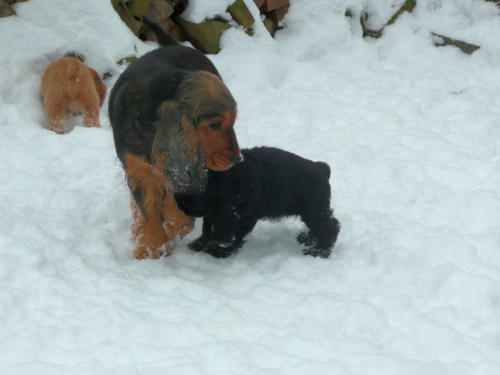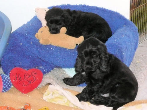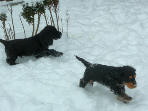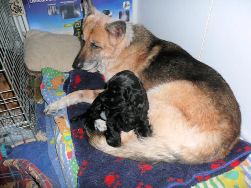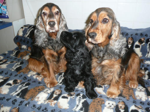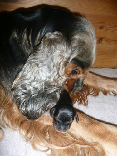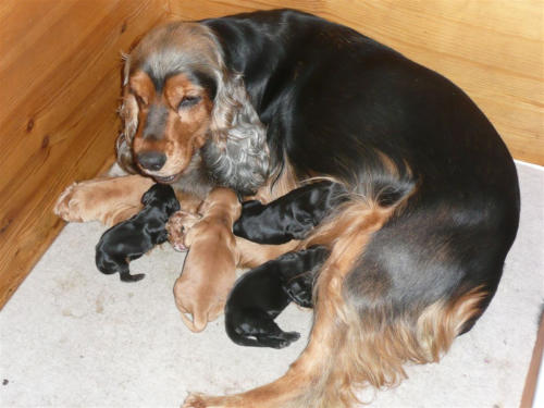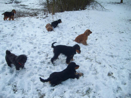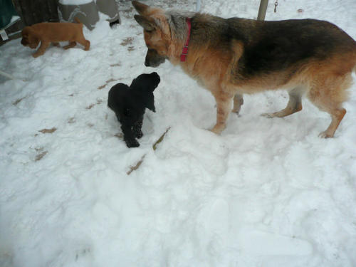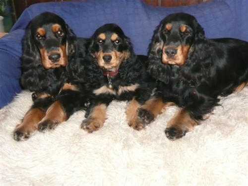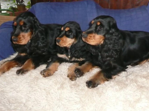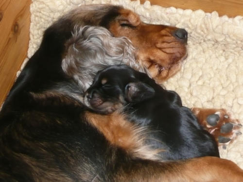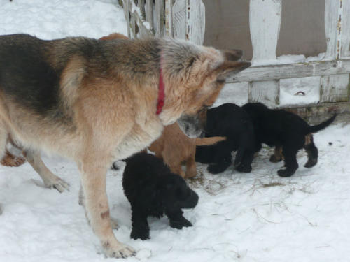 und eine Hündin in den Farben schwarz mit loh, rot und schwarz.